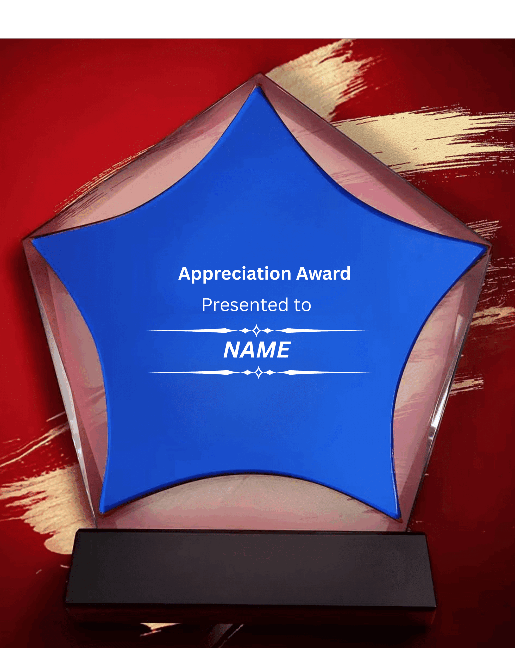 Made from premium crystal, this elegant trophy features a striking five-pointed star design and can be personalized with names, logos, or messages. Ideal for corporate recognition, employee appreciation, academic achievements, or special milestones, it makes a memorable keepsake that shines on any display.
